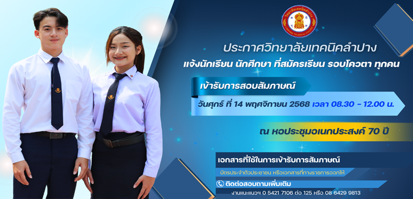 - คู่มือการรับสมัครนักเรียน นักศึกษา เข้าศึกษาต่อวิทยาลัยเทคนิคลำปาง ประเภทโควต้า ระบบปกติ และ ระบบทวิภาคี ปีการศึกษา ๒๕๖๙ (13 พฤศจิกายน 2568)