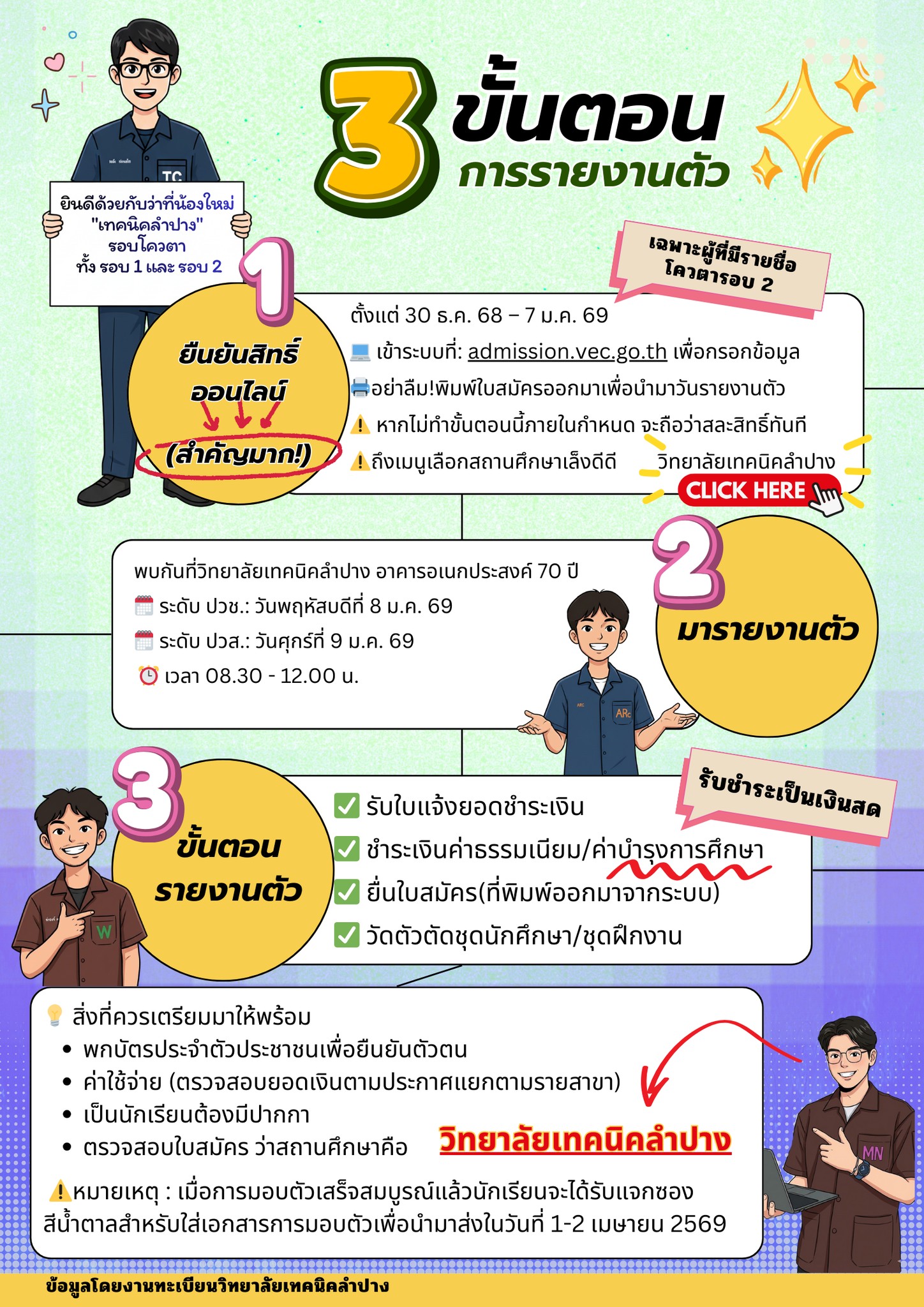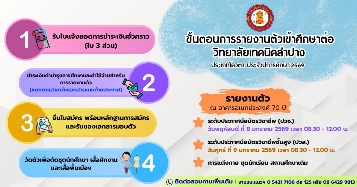 - ประกาศ รายชื่อผู้มีสิทธิ์มอบตัวเข้าศึกษาต่อวิทยาลัยเทคนิคลำปาง ประเภทโควตาเรียนดีสถานศึกษา (รอบ ๒) ประจำปีการศึกษา ๒๕๖๙ (24 ธันวาคม 2568)