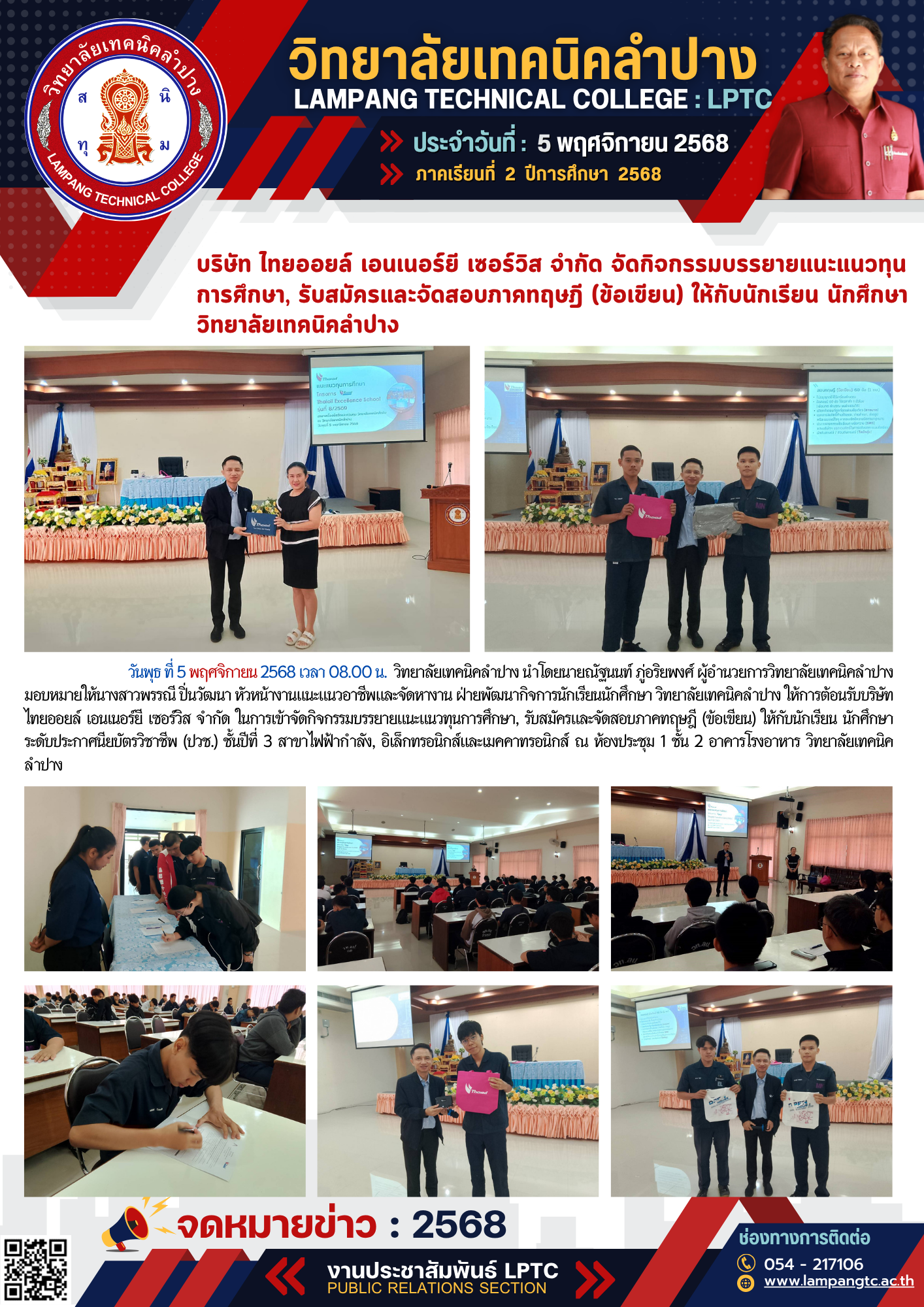 บริษัท ไทยออยล์ เอนเนอร์ยี เซอร์วิส จำกัด จัดกิจกรรมบรรยายแนะแนวทุนการศึกษา, รับสมัครและจัดสอบภาคทฤษฎี (ข้อเขียน) ให้กับนักเรียน นักศึกษา วิทยาลัยเทคนิคลำปาง