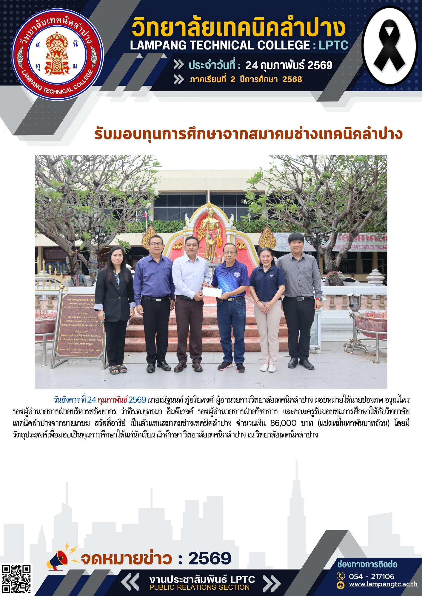 รับมอบทุนการศึกษาจากสมาคมช่างเทคนิคลำปาง