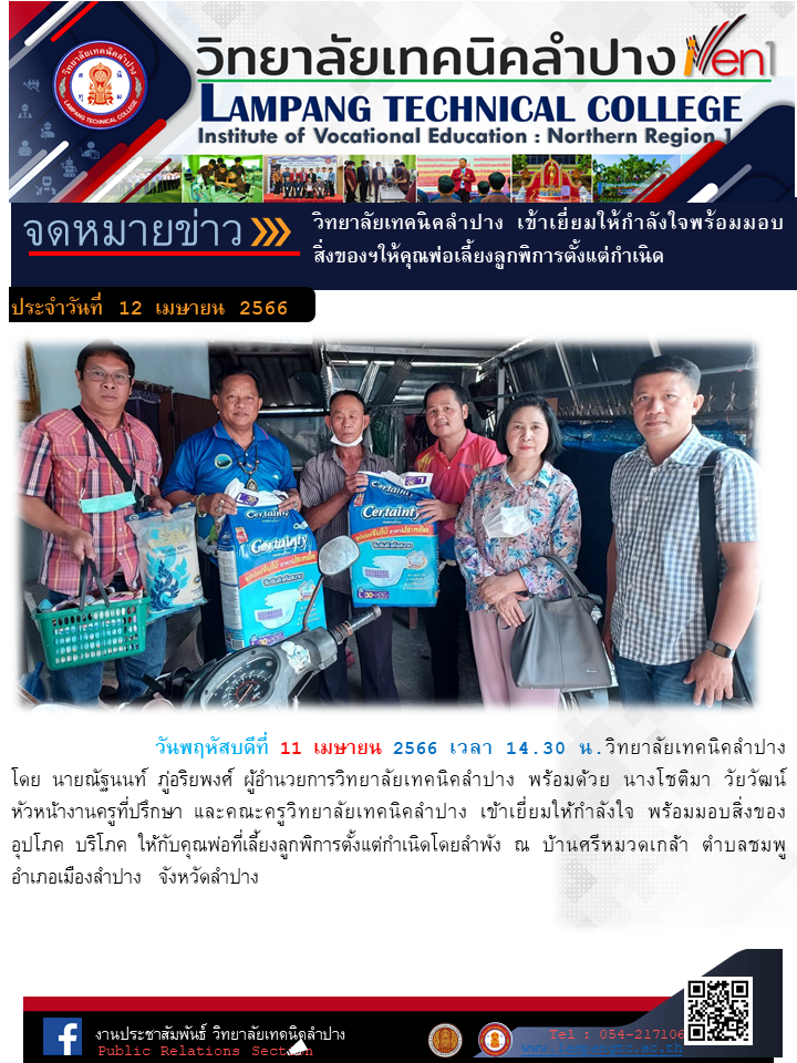 วิทยาลัยเทคนิคลำปาง เข้าเยี่ยมให้กำลังใจพร้อมมอบสิ่งของฯให้คุณพ่อเลี้ยงลูกพิการตั้งแต่กำเนิด No ratings yet. 12 เมษายน 2566น.ส.สุวิมล อนาวันจดหมายข่าว กรุณาให้คะแนนความพึงพอใจ ระดับความพึงพอใจ Post Views: 326 FacebookFacebookXXLINELine