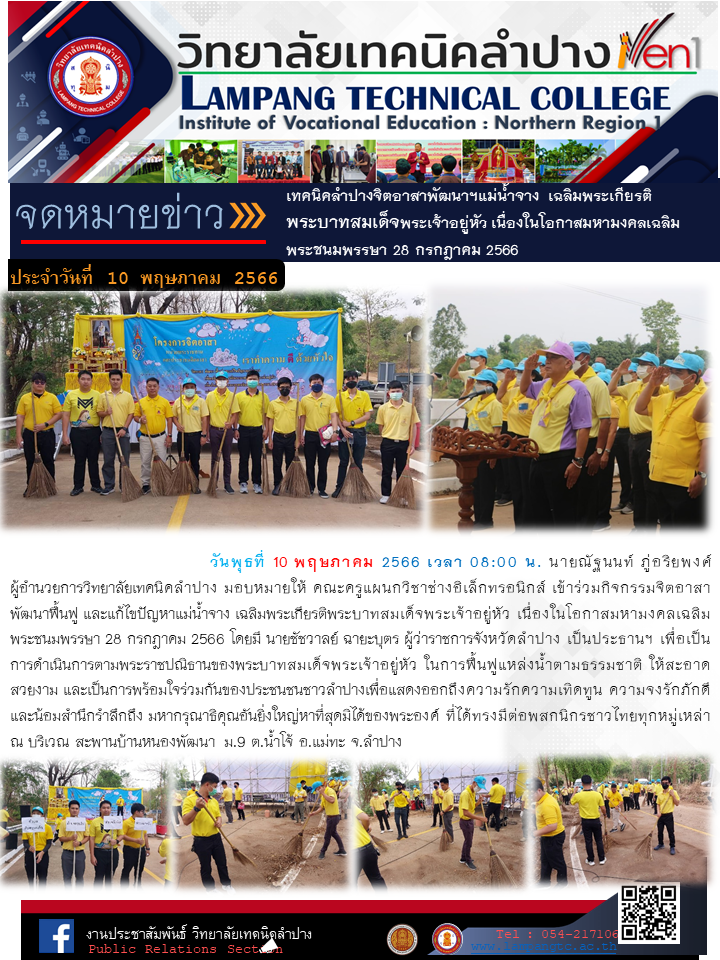 เทคนิคลำปางจิตอาสาพัฒนาฯแม่น้ำจาง เฉลิมพระเกียรติพระบาทสมเด็จพระเจ้าอยู่หัว เนื่องในโอกาสมหามงคลเฉลิมพระชนมพรรษา 28 กรกฎาคม 2566 No ratings yet. 10 พฤษภาคม 2566น.ส.สุวิมล อนาวันจดหมายข่าว กรุณาให้คะแนนความพึงพอใจ ระดับความพึงพอใจ Post Views: 235 FacebookFacebookXXLINELine