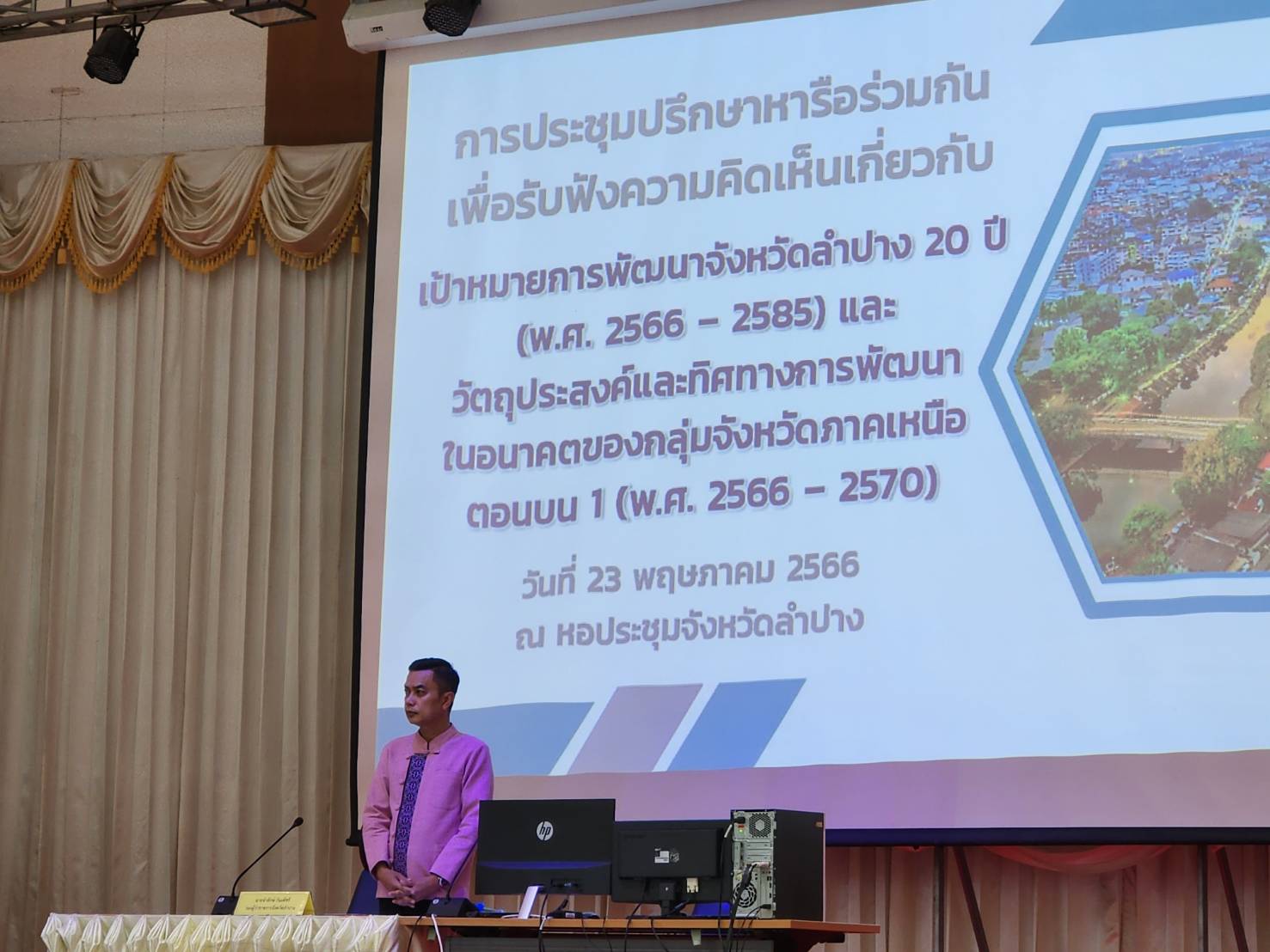 วันอังคารที่ 23 พฤษภาคม 2566 เวลา 13.30 น. นายณัฐนนท์ ภู่อริยพงศ์ ผู้อำนวยการวิทยาลัยเทคนิคลำปาง พร้อมด้วย นางสาวพัชรีย์ สาระยิ่ง รองผู้อำนวยการฝ่ายแผนงานและความร่วมมือ เข้าร่วมการประชุมปรึกษาหารือเพื่อรับฟังความคิดเห็น เกี่ยวกับเป้าหมายการพัฒนาจังหวัดลำปาง 20 ปี โดยนายชัชวาลย์ ฉายะบุตร ผู้ว่าราชการจังหวัดลำปาง มอบหมายให้ นายจำลักษ์ กันเพ็ชร์ รองผู้ว่าราชการจังหวัดลำปาง เป็นประธานการประชุมฯ โดยมี ดร.ขวัญนภา สุขคร ผู้อำนวยการศูนย์การศึกษาลำปาง มหาวิทยลัยสวนดุสิต เป็นวิทยากรในการบรรยายฯ วัตถุประสงค์การประชุมในครั้งนี้ เพื่อนำเสนอเป้าหมายการพัฒนาจังหวัดลำปาง 20 ปี (พ.ศ. 2566 – 2585) และวัตถุประสงค์และทิศทางการพัฒนาในอนาคตของกลุ่มจังหวัดภาคเหนือตอนบน 1 (พ.ศ. 2566 – 2570) ต่อสาธารณชน และรับฟังความคิดเห็นที่มีต่อแผนพัฒนาจังหวัดลำปาง ณ หอประชุมจังหวัดลำปาง