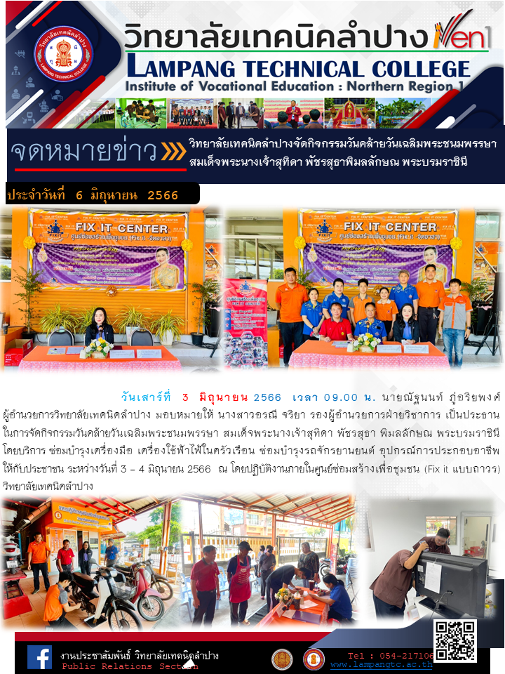 วิทยาลัยเทคนิคลำปางจัดกิจกรรมวันคล้ายวันเฉลิมพระชนมพรรษา สมเด็จพระนางเจ้าสุทิดา พัชรสุธาพิมลลักษณ พระบรมราชินี No ratings yet. 6 มิถุนายน 2566น.ส.สุวิมล อนาวันจดหมายข่าว กรุณาให้คะแนนความพึงพอใจ ระดับความพึงพอใจ Post Views: 224 FacebookFacebookXXLINELine