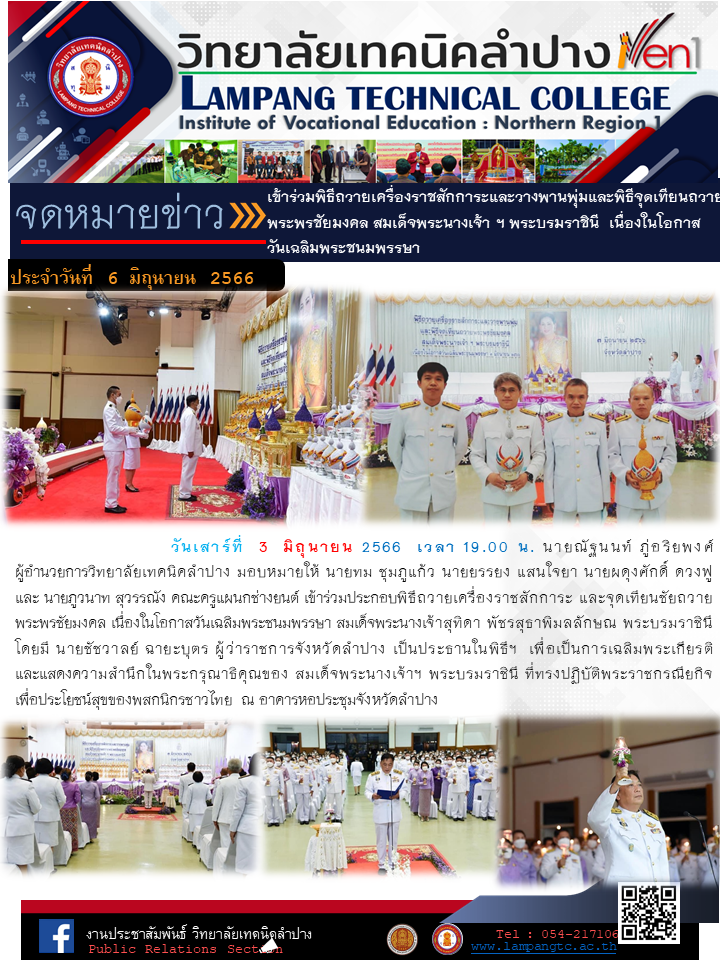 เข้าร่วมพิธีถวายเครื่องราชสักการะและวางพานพุ่มและพิธีจุดเทียนถวาย พระพรชัยมงคล สมเด็จพระนางเจ้า ฯ พระบรมราชินี เนื่องในโอกาส วันเฉลิมพระชนมพรรษา No ratings yet. 6 มิถุนายน 2566น.ส.สุวิมล อนาวันจดหมายข่าว กรุณาให้คะแนนความพึงพอใจ ระดับความพึงพอใจ Post Views: 200 FacebookFacebookXXLINELine