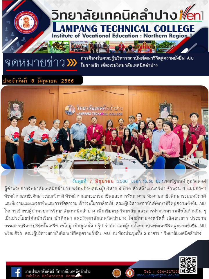 การต้อนรับคณะผู้บริหารสถาบันพัฒนาชีวิตสู่ความยั่งยืน AIU ในการเข้าเยี่ยมชมวิทยาลัยเทคนิคลำปาง No ratings yet. 8 มิถุนายน 2566น.ส.สุวิมล อนาวันจดหมายข่าว กรุณาให้คะแนนความพึงพอใจ ระดับความพึงพอใจ Post Views: 211 FacebookFacebookXXLINELine