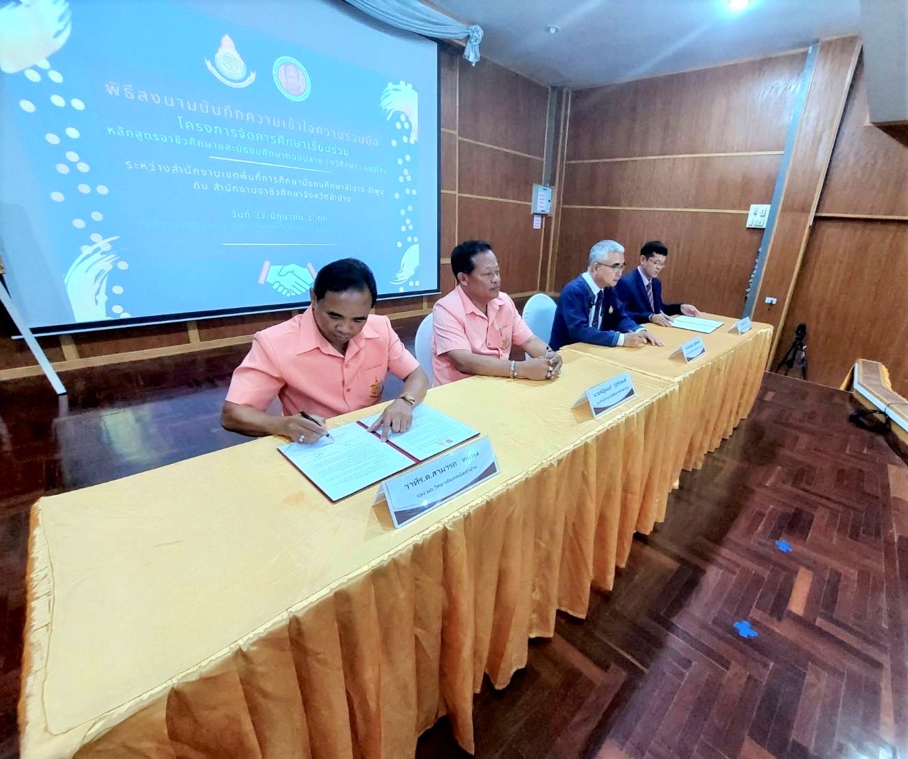 วันอังคารที่ 27 มิถุนายน 66 เวลา 09.00 น. นายณัฐนนท์ ภู่อริยพงศ์ ผู้อำนวยการสำนักงานอาชีวศึกษาจังหวัดลำปาง และ นายเจริญชัย กิตติพีรเดช ผู้อำนวยการสำนักงานเขตพื้นที่การศึกษามัธยมศึกษาลำปาง ลำพูน ร่วมลงนามบันทึกความเข้าใจความร่วมมือ โครงการจัดการศึกษาเรียนร่วมหลักสูตรอาชีวศึกษาและมัธยมศึกษาตอนปลาย (ทวิศึกษา) แนวใหม่ โดยมี ว่าที่ร้อยตรีสามารถ พุแพง เลขานุการอาชีวศึกษาจังหวัดลำปาง และ นายจิรัฐพงศ์ สุมนะ รองผู้อำนวยการสำนักงานเขตพื้นที่การศึกษามัธยมศึกษาลำปาง ลำพูน ร่วมเป็นพยานในการลงนาม ณ สำนักงานเขตพื้นที่การศึกษามัธยมศึกษาลำปาง ลำพูน อำเภอเมืองลำปาง จังหวัดลำปาง
