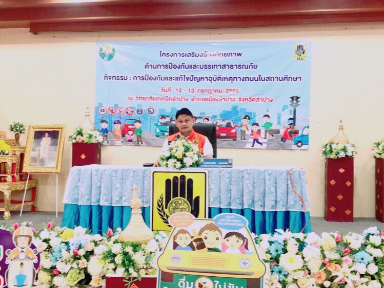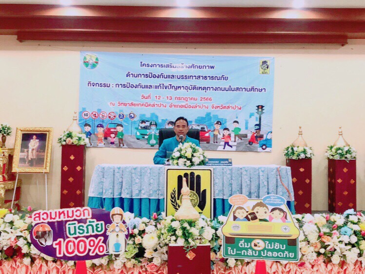 วันพฤหัสบดีที่ 13กรกฎาคม 2566 เวลา 08.45 น. วิทยาลัยเทคนิคลำปาง ร่วมกับศูนย์อำนวยการความปลอดภัยทางถนนจังหวัดลำปาง จัดกิจกรรมการป้องกันและแก้ไขปัญหาอุบัติเหตุทางถนนในสถานศึกษา ภายใต้โครงการเสริมสร้างศักยภาพ ด้านการป้องกันและบรรเทาสาธารณภัย โดย นายณัฐนนท์ ภู่อริยพงศ์ ผู้อำนวยการวิทยาลัยเทคนิคลำปาง มอบหมายให้ ว่าที่ร้อยตรีสามารถ พุแพง รองผู้อำนวยการฝ่ายพัฒนากิจการนักเรียนนักศึกษา กล่าวต้อนรับ โดยมี นายชนาธิป เสมแย้ม รองผู้ว่าราชการจังหวัดลำปาง เป็นประธาน วัตถุประสงค์เพื่อให้ นักเรียนนักศึกษาของวิทยาลัยเทคลำปาง สร้างการรับรู้ มีจิตสำนึก ความตระหนักด้านความปลอดภัย (Safety Mind) ร่วมสร้างวัฒนธรรมความปลอดภัย (Safety Culture)มีส่วนร่วมในกิจกรรม มีการอบรมการป้องกันและลดอุบัติเหตุ, การสร้างสื่อประชาสัมพันธ์ การวางแผนดำเนินการป้องกันและลดอุบัติเหตุทางถนน การตีเส้นแนวจราจรหน้าวิทยาลัย ได้ความรู้การขับขี่ปลอดภัยสร้างวินัยจราจร การอบรมจัดขึ้น ระหว่างวันที่ 13-14 กรกฎาคม 2566 ณ วิทยาลัยเทคนิคลำปาง