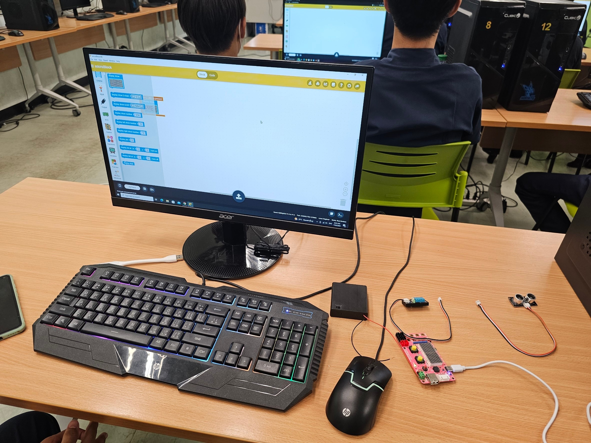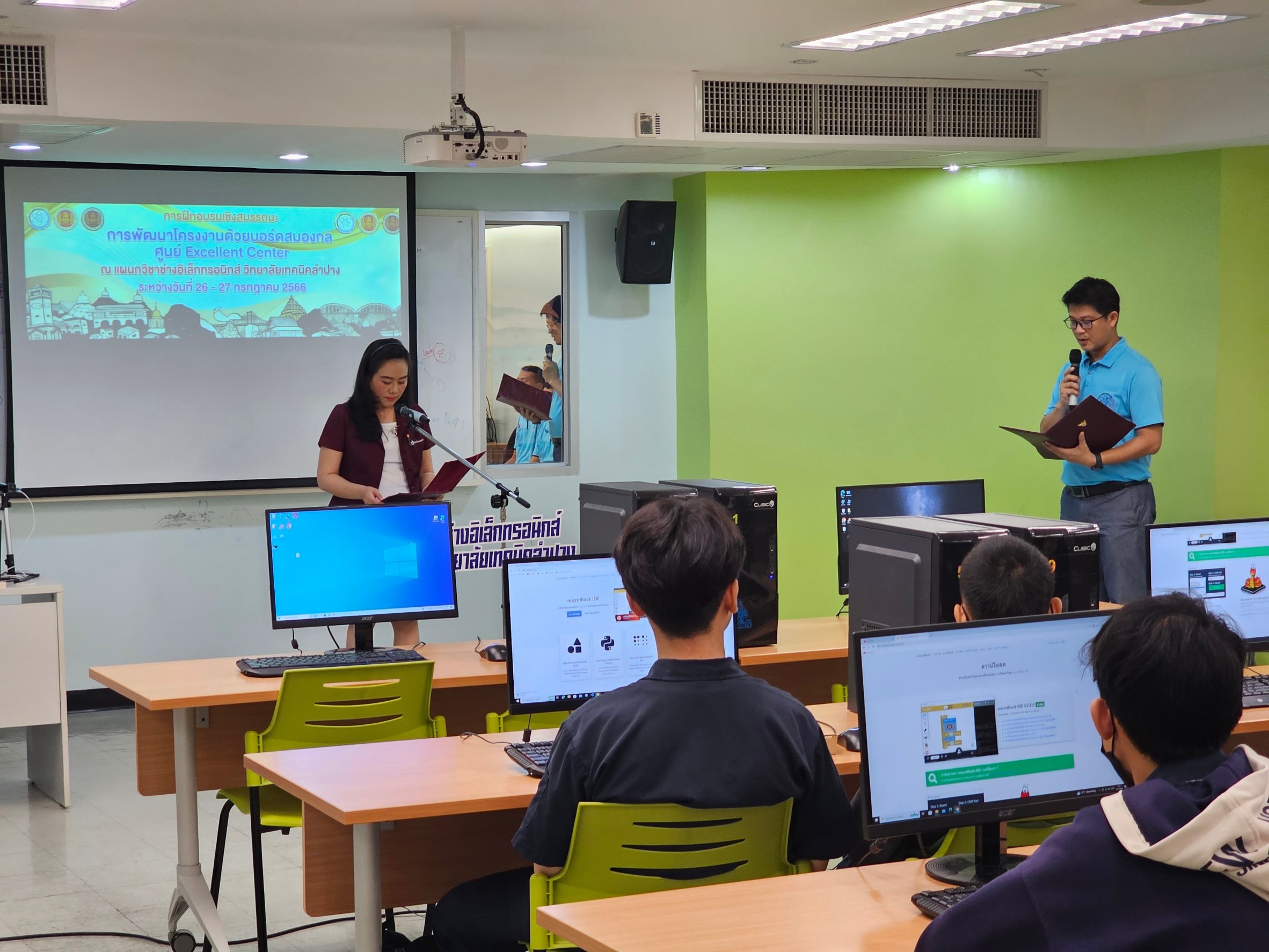 วันพุธที่ 26 กรกฎาคม 2566 เวลา 08.30 น. แผนกวิชาช่างอิเล็กทรอนิกส์ จัดกิจกรรมโครงการอบรมการพัฒนาโครงงานด้วยบอร์ดสมองกล กิจกรรมจัดขึ้นระหว่างวันที่ 26-27 กรกฎาคม 2566 โดยนางสาวอรณี จริยา รองผู้อำนวยการฝ่ายวิชาการให้เกียรติเป็นประธาน เปิดโครงการฯ โดยมี อาจารย์ณรงค์ เครือกันทา จาก มหาวิทยลัยราชภัฎลำปาง เป็นวิทยากรอบรมนักเรียน นักศึกษาในครั้งนี้ วัตถุประสงค์เพื่อฝึกอบรมให้ความรู้แก่ นักเรียน นักศึกษาสาขาช่างอิเล็กทรอนิกส์ และเทคโนโลยีคอมพิวเตอร์ ระดับ ปวช.2 เพื่อมุ่งมั่นผลิตและพัฒนากำลังคนให้มีทักษะ และความเชี่ยวชาญเฉพาะทาง ด้านโปรแกรมมิ่งสมองกลฝังตัว embeded system และ IOTs เพื่อใช้ควบคุมอุปกรณ์อิเล็กทรอนิกส์ โดยเป็นไปตามโครงการพัฒนาศูนย์ความเป็นเลิศทางการอาชีวศึกษา (Excellent center) ปีการศึกษา 2566 ณ อาคารแผนกวิชาช่างอิเล็กทรอนิกส์ วิทยาลัยเทคนิคลำปาง