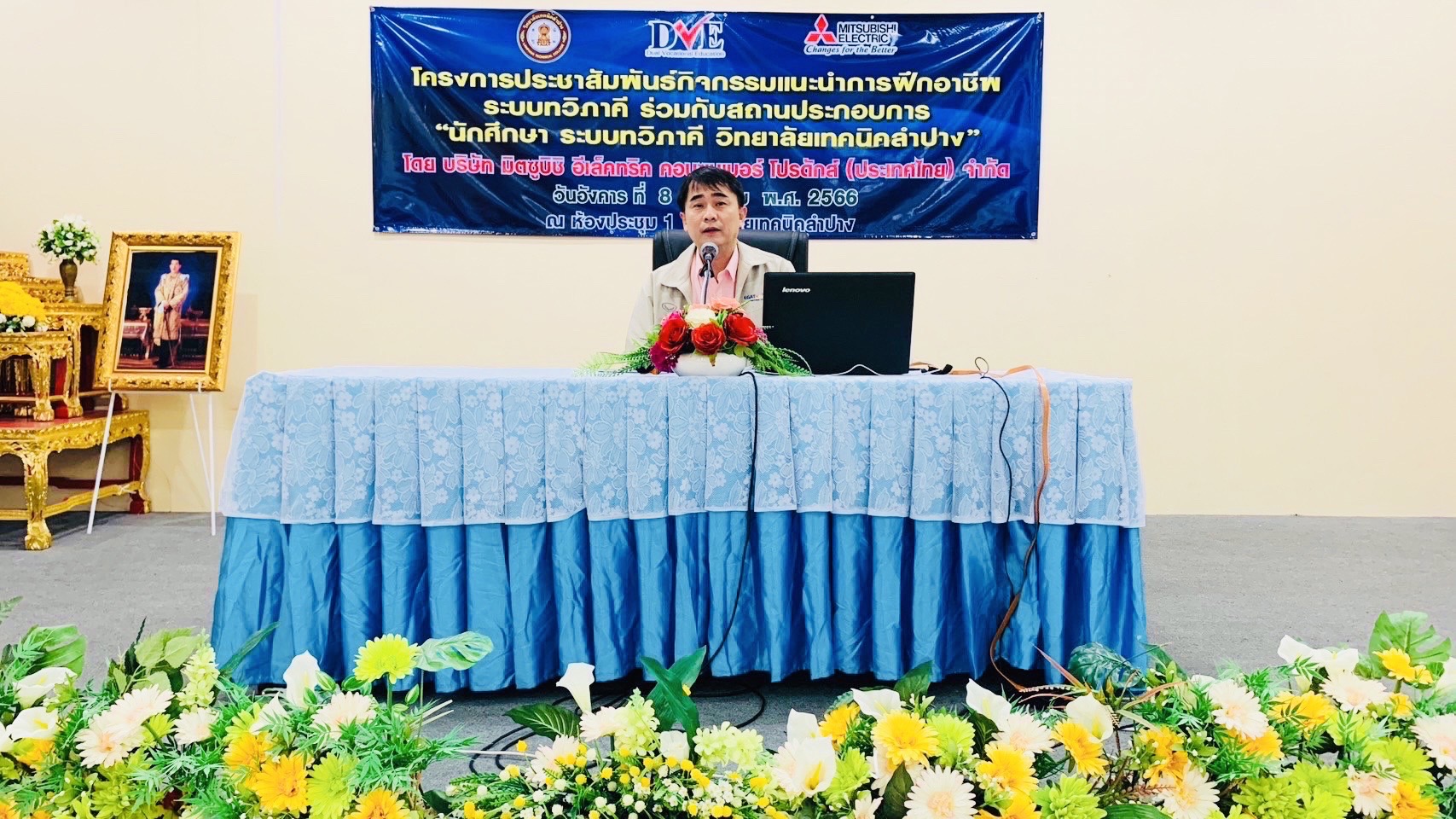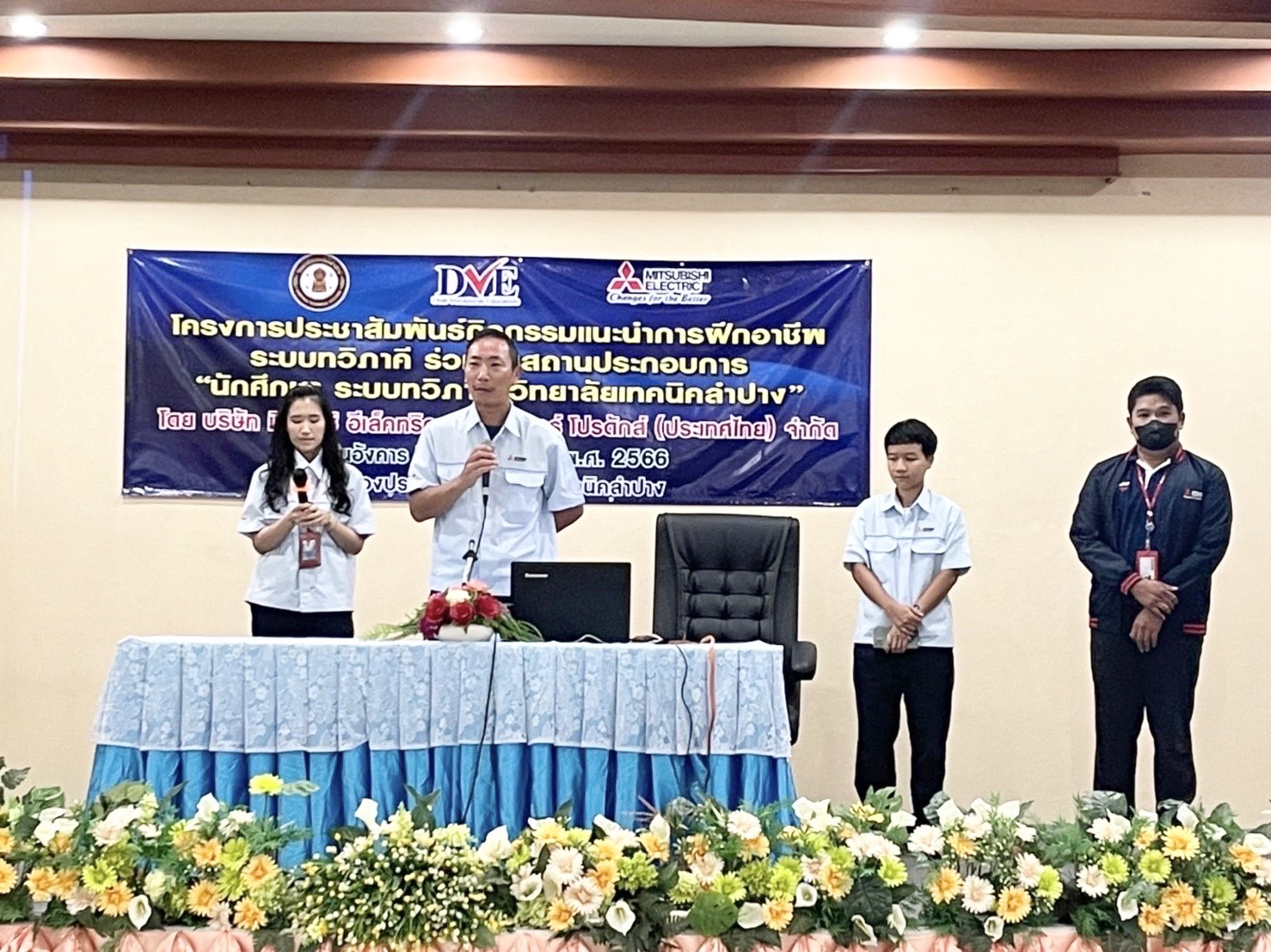 วันอังคารที่ 8 สิงหาคม 2566 เวลา 09.30 น. นายณัฐนนท์ ภู่อริยพงศ์ ผู้อำนวยการวิทยาลัยเทคนิคลำปาง มอบหมายให้นายธนพล ทิพย์กัญญานนท์ รองผู้อำนวยการฝ่ายแผนงานและความร่วมมือ ได้เป็นประธานในพิธีเปิดกิจกรรมโครงการประชาสัมพันธ์กิจกรรมแนะนำการฝึกอาชีพ ระบบทวิภาคี ร่วมกับ บริษัท มิตซูบิชิ อีเล็คทริค คอนซูเมอร์ โปรดักส์ (ประเทศไทย) จำกัด พร้อมด้วย นางสาวอรณี จริยา รองผู้อำนวยการฝ่ายวิชาการ ทีมงานอาชีวศึกษาระบบทวิภาคี คณะครู และนักศึกษา แผนกวิชาช่างอิเล็กทรอนิกส์ แผนกวิชาช่างกลโรงงาน แผนกวิชาช่างไฟฟ้ากำลัง แผนกวิชาเมคคาทรอนิกส์ เข้าร่วมต้อนรับ และรับฟังการประชาสัมพันธ์เชิญชวนนักศึกษา เข้ารับการฝึกอาชีพในสถานประกอบการ และหลักเกณฑ์การฝึกอาชีพ ซึ่งมีรายละเอียดต่าง ๆ เพื่อให้นักศึกษา ได้รับทราบข้อมูลเกี่ยวกับการฝึกอาชีพในสถานประกอบการ นำโดย Mr. Yoichi Horii ผู้ช่วยผู้จัดการฝ่ายทรัพยากรบุคคล และบริหารทั่วไป พร้อมทีมงาน ณ ห้องประชุม 1 ชั้น 2 อาคารโรงอาหาร วิทยาลัยเทคนิคลำปาง
