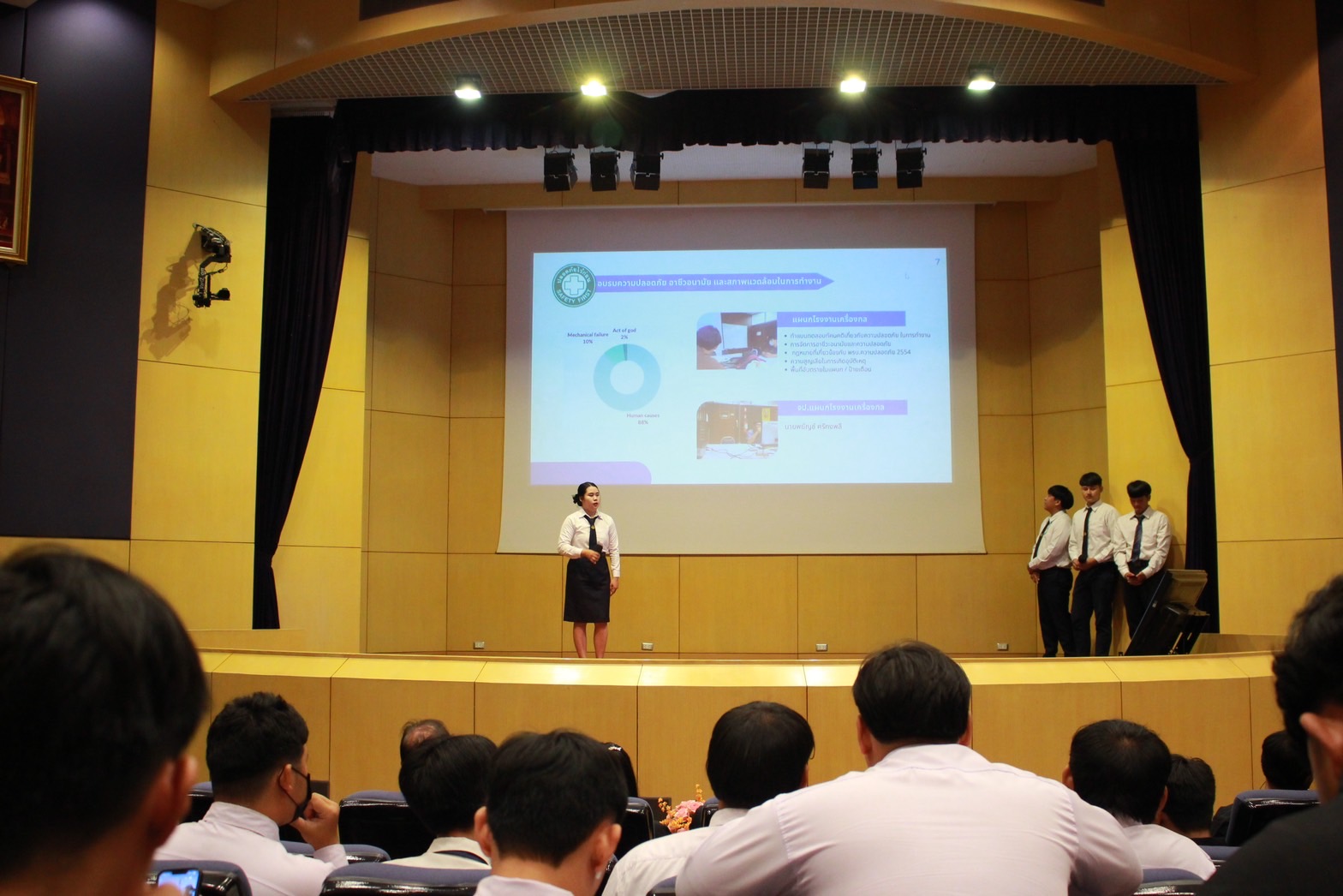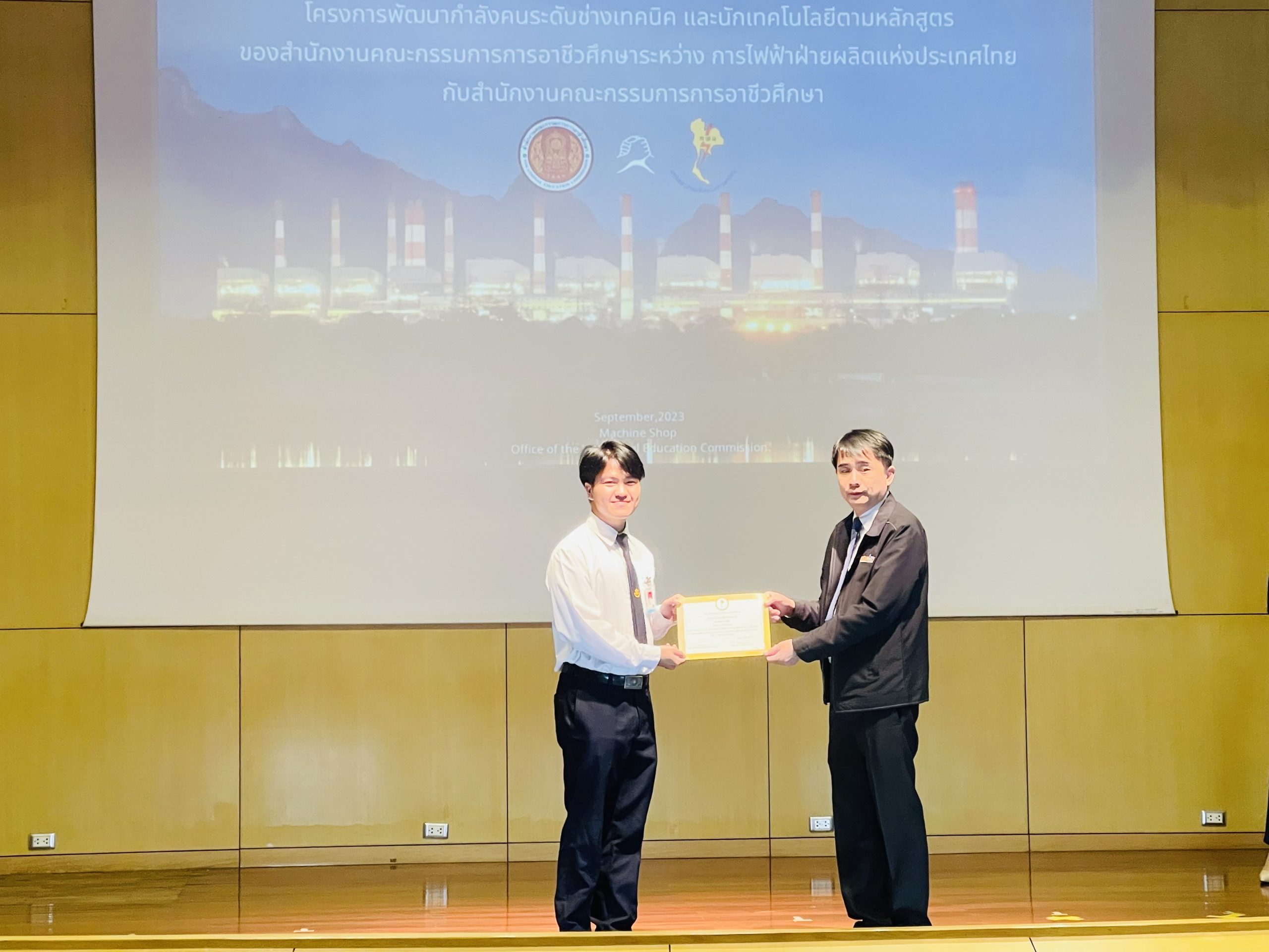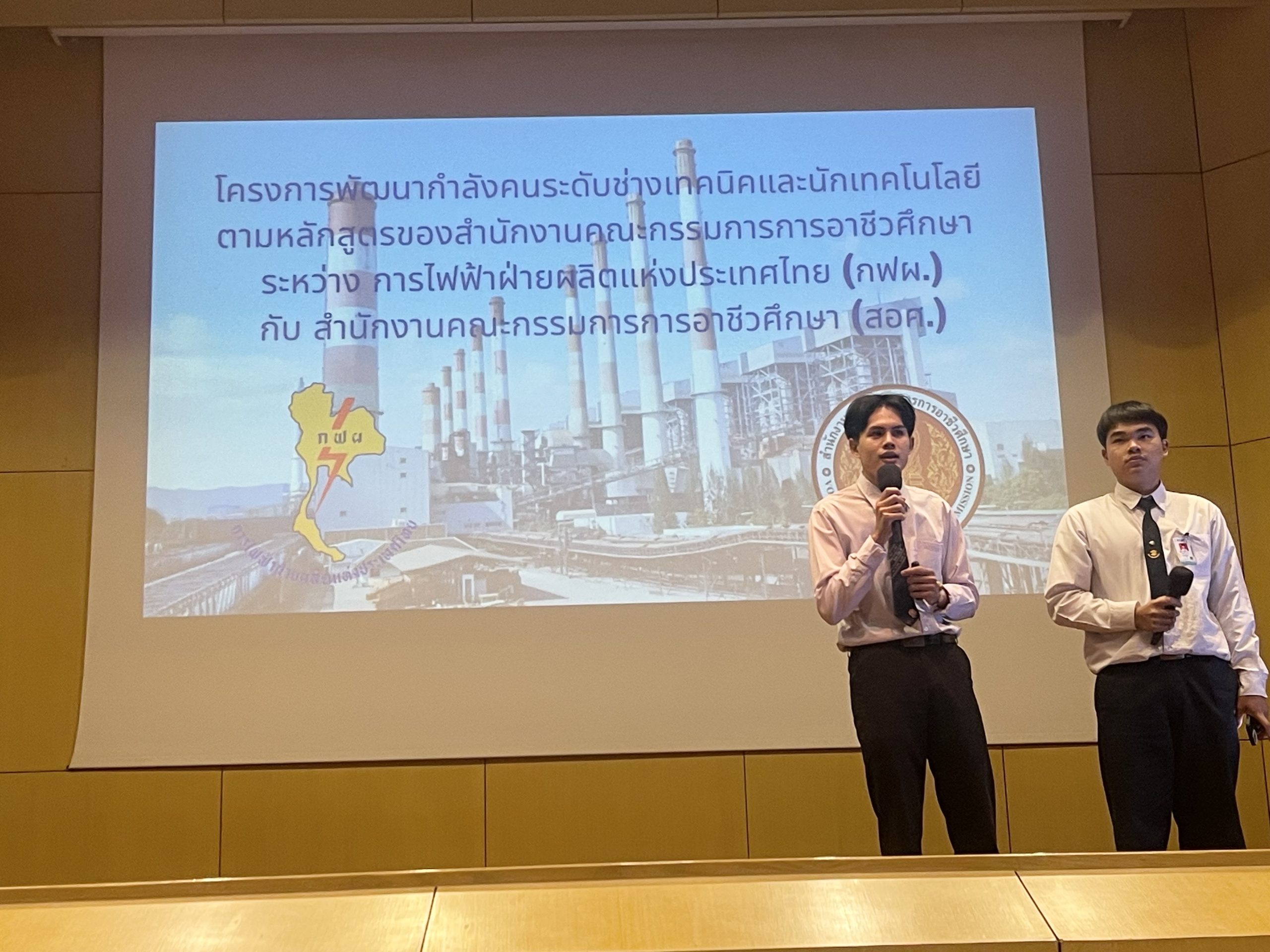 วันศุกร์ ที่ 1 กันยายน 2566 เวลา 09.00 น. นายณัฐนนท์ ภู่อริยพงศ์ ผู้อำนวยการวิทยาลัยเทคนิคลำปาง มอบหมายให้ นายธนพล ทิพย์กัญญานนท์ รองผู้อำนวยการฝ่ายแผนงานและความร่วมมือ พร้อมด้วย นายสุทัศน์ สุขารมย์ หัวหน้างานอาชีวศึกษาระบบทวิภาคี หัวหน้าแผนกวิชา คณะครู และทีมงานอาชีวศึกษาระบบทวิภาคี ที่เกี่ยวข้องในการจัดอาชีวศึกษาระบบทวิภาคี โครงการฯ กฟผ.-สอศ. จำนวน 3 แผนกวิชา ได้แก่ แผนกวิชาช่างยนต์ แผนกวิชาช่างกลโรงงาน แผนกวิชาช่างไฟฟ้ากำลัง เป็นตัวแทนในการเข้าร่วมรับฟังการนำเสนอผลการฝึกอาชีพในสถานประกอบการ ตามหลักสูตรของสำนักงานคณะกรรมการการอาชีวศึกษา ระหว่าง การไฟฟ้าฝ่ายผลิตแห่งประเทศไทย (กฟผ.) กับ สำนักงานคณะกรรมการการอาชีวศึกษา (สอศ.) หรือ โครงการฯ กฟผ.-สอศ. ประจำปี 2566 โดยมี นายวราวุธ มีมนต์ษม วิศวกรระดับ 9 ฝ่ายพัฒนาศักยภาพทรัพยากรบุคคลและคุณภาพ กองพัฒนาศักยภาพบุคลากรด้านเชื้อเพลิงและธุรกิจเกี่ยวเนื่อง (ศูนย์ฝึกอบรมแม่เมาะ) เป็นประธานในพิธี เปิดการนำเสนอการฝึกอาชีพ และในการนี้ ศูนย์ฝึกอบรมแม่เมาะ ได้เรียนเชิญนายธนพล ทิพย์กัญญานนท์ รองผู้อำนวยการฝ่ายแผนงานและความร่วมมือ เป็นผู้แทนกล่าวขอบคุณทีมงานศูนย์ฝึกอบรมแม่เมาะ ครูฝึกในโครงการ กฟผ.-สอศ. และกล่าวให้กำลังใจนักศึกษา ในโครงการฯ กฟผ.-สอศ. พร้อมเป็นผู้แทนมอบประกาศนียบัตร ให้แก่นักศึกษา วิทยาลัยเทคนิคลำปาง และวิทยาลัยเทคนิค กฟผ.แม่เมาะ ที่ผ่านการฝึกอาชีพ ในโครงการฯ กฟผ.-สอศ. ณ ห้องเมาะหลวง อาคารสมานฉันท์ธัชชวาล ศูนย์ฝึกอบรมแม่เมาะ จังหวัดลำปาง