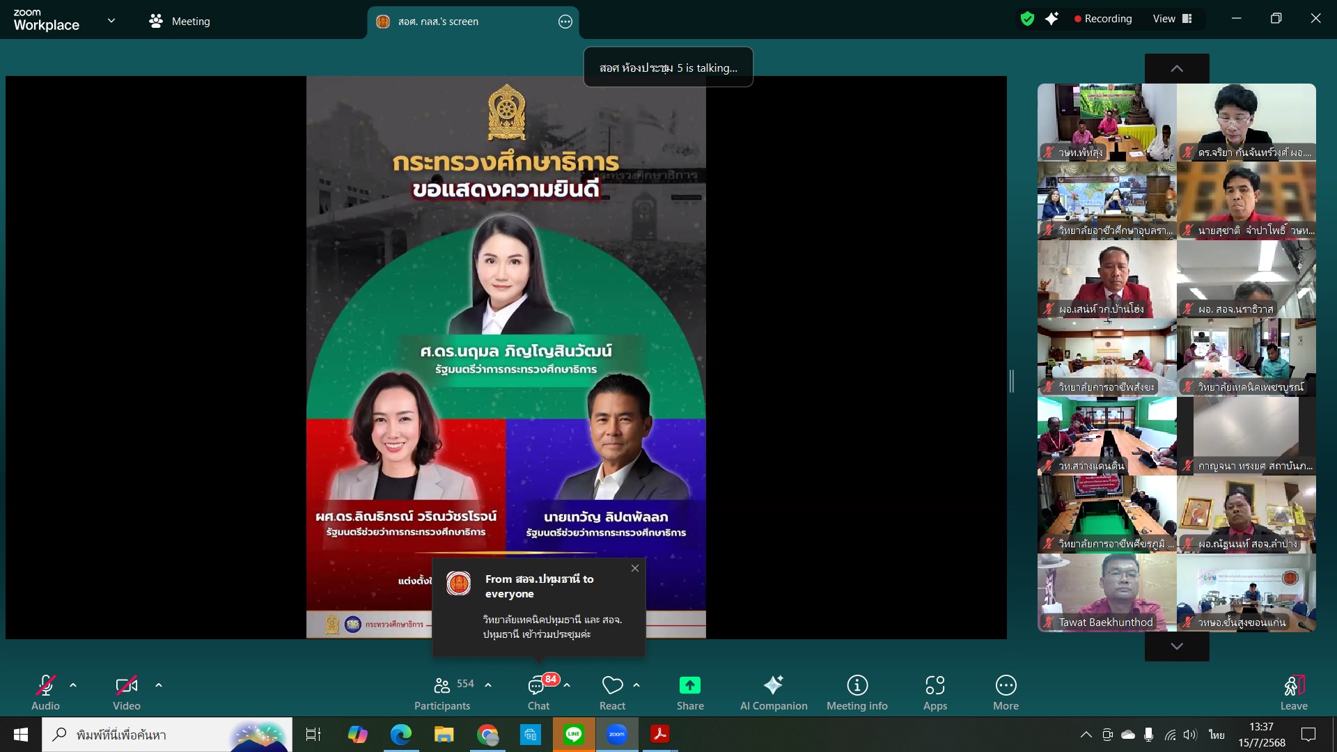วันอังคาร ที่ 14 กรกฎาคม 2568 เวลา 13.30 น. นายณัฐนนท์ ภู่อริยพงศ์ ผู้อำนวยการวิทยาลัยเทคนิคลำปาง ปฏิบัติหน้าที่ผู้อำนวยการสำนักงานอาชีวศึกษาจังหวัดลำปาง เข้าร่วมการประชุมผู้บริหารสำนักงานคณะกรรมการการอาชีวศึกษา ครั้งที่ 5/2568 ผ่านระบบ ZOOM เพื่อรับฟังรายงานผลการเบิกจ่ายงบประมาณ ประจำปีงบประมาณ พ.ศ. 2568, ผลการรับนักเรียน ประจำปีงบประมาณ พ.ศ. 2568, ผลการแข่งขันหุ่นยนต์อาชีวศึกษา ระดับชาติ ประจำปีพุทธศักราช 2568, การประกวดโครงงานวิทยาศาสตร์อาชีวศึกษา ประจำปีพุทธศักราช 2568, การแข่งขันหุ่นยนต์ ABU ชิงชนะเลิศประเทศไทย ประจำปีพุทธศักราช 2568 และรายงานผลการดำเนินการบริหารจัดการทุนส่งเสริมวิทยาศาสตร์ วิจัยและนวัตกรรมภายได้โครงการขับเคลื่อนวัดกรรมสิ่งประดิษฐ์อาชีวศึกษา ประจำปิงประมาณ พ.ศ. 2568 ณ ห้องประชุม 5 (ชั้น 1) สำนักงานคณะกรรมการการอาชีวศึกษา