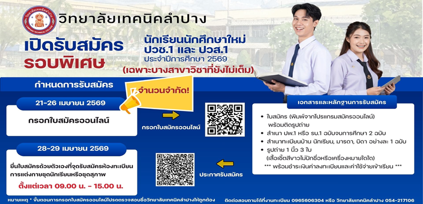 ประกาศ การรับนักเรียน นักศึกษา เข้าศึกษาต่อวิทยาลัยเทคนิคลำปาง รอบพิเศษ ระบบปกติ ระบบทวิภาคี และผู้มีความบกพร่องทางร่างกาย ประจำปีการศึกษา ๒๕๖๙ No ratings yet. 20 เมษายน 256923 เมษายน 2026พุทธรัตน์ เจียมศิริอังกูรประกาศวิทยาลัย ประกาศ การรับนักเรียน นักศึกษา เข้าศึกษาต่อวิทยาลัยเทคนิคลำปาง รอบพิเศษ ระบบปกติ ระบบทวิภาคี และผู้มีความบกพร่องทางร่างกาย ประจำปีการศึกษา ๒๕๖๙ อ่านรายละเอียดเพิ่มเติม !!สมัครเรียนออนไลน์!! กรุณาให้คะแนนความพึงพอใจ ระดับความพึงพอใจ Post Views: 86 FacebookFacebookXXLINELine