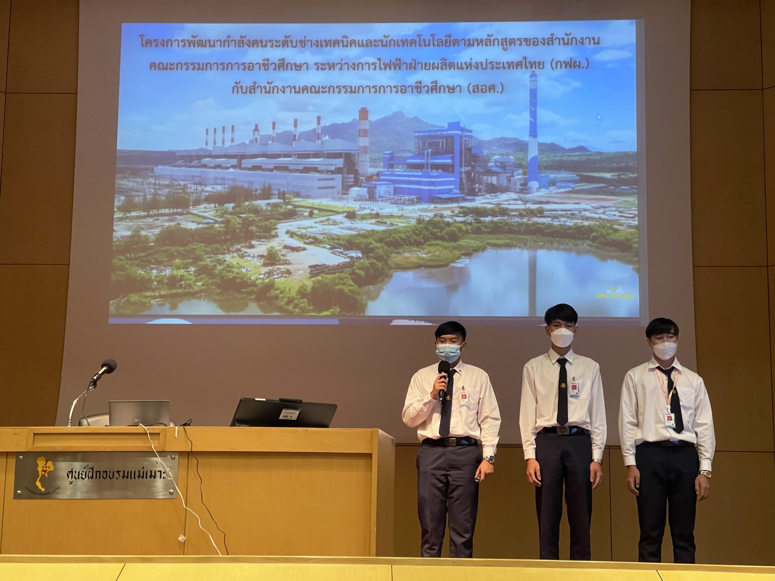 วันพฤหัสที่ 8 กันยายน 2565 นายณัฐนนท์ ภู่อริยพงศ์ ผู้อำนวยการวิทยาลัยเทคนิคลำปาง นำคณะทีมงาน ประกอบไปด้วย นายธนพล ทิพย์กัญญานนท์ รองผู้อำนวยการฝ่ายวิชาการ ทีมงานอาชีวศึกษาระบบทวิภาคี และคณะครูแผนกวิชาช่างยนต์ ช่างกลโรงงาน และช่างไฟฟ้ากำลัง เข้าร่วมรับฟัง และให้ข้อเสนอแนะการนำเสนอผลการฝึกอาชีพ พร้อมให้โอวาท เพื่อสร้างขวัญกำลังใจให้กับนักศึกษา โครงการ กฟผ. – สอศ. ประจำปีการศึกษา 2565 โดยมีนายบุญธันทว์ เอมย่านยาว วิศวกร ระดับ 11 รวฟ.ชฟฟ.2 อฟม. (โรงไฟฟ้าแม่เมาะ)