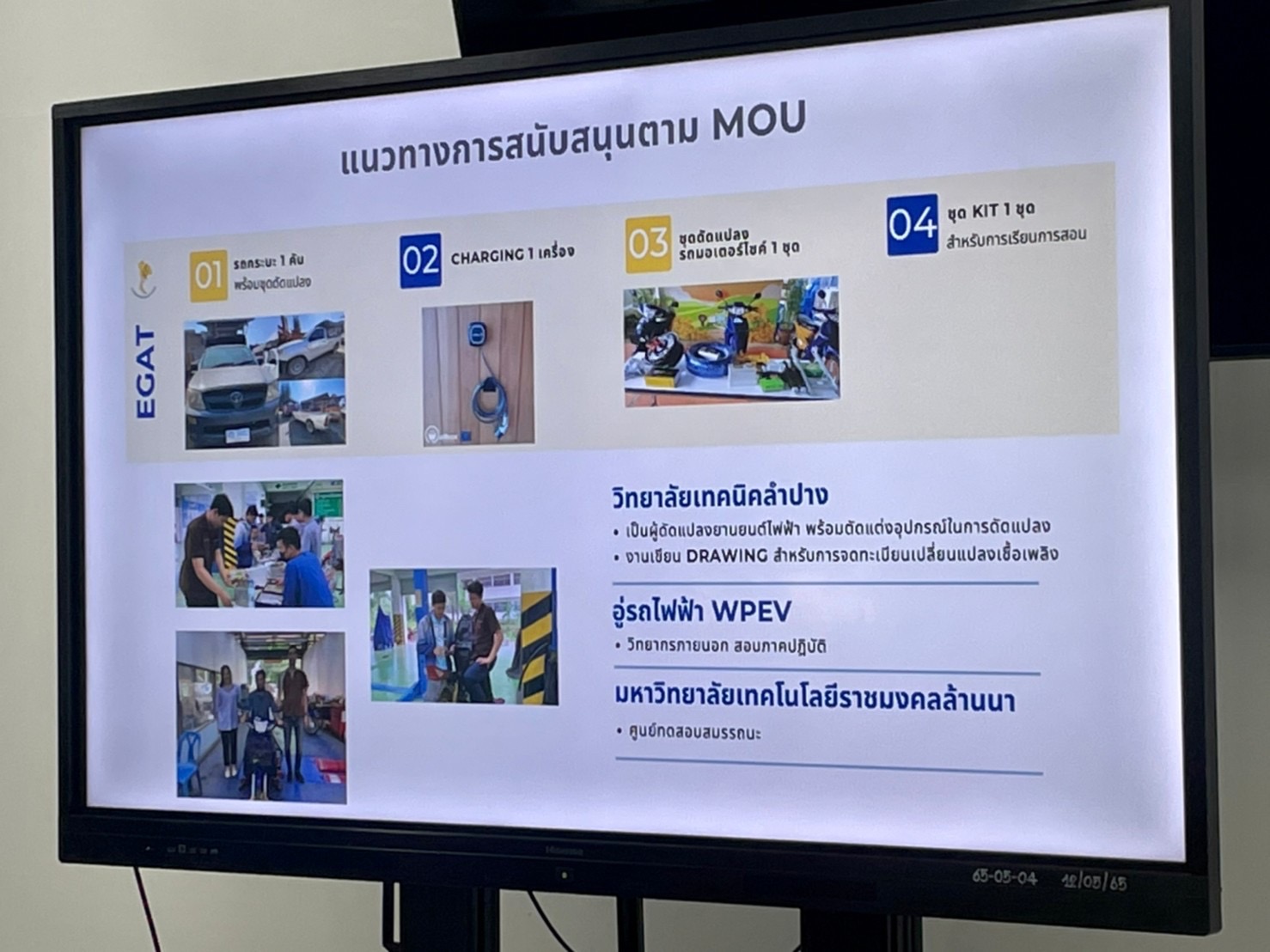 วันศุกร์ ที่ 27 มกราคม 2566 นายณัฐนนท์ ภู่อริยพงศ์ ผู้อำนวยการวิทยาลัยเทคนิคลำปาง มอบหมายให้ นางสาวอรณี จริยา รองผู้อำนวยการฝ่ายวิชาการ นำทีมงานอาชีวศึกษาระบบทวิภาคี พร้อมคณะครูแผนกวิชาช่างยนต์ และครูแผนกวิชาช่างไฟฟ้ากำลัง เข้าร่วมประชุมหารือ ร่วมกับคณะผู้บริหาร และทีมงานยานยนต์ไฟฟ้าดัดแปลง (EV Conversion) การไฟฟ้าฝ่ายผลิตแห่งประเทศ กฟผ.แม่เมาะ ในการมอบครุภัณฑ์ รถยนต์สำหรับการดัดแปลงเป็นรถยนต์ไฟฟ้า และสนับสนุนงบประมาณ ตาม MOU เพื่อเป็นครุภัณฑ์ในการจัดเรียนการสอน สำหรับการทำรถยานยนต์ไฟฟ้าดัดแปลง (EV Conversion) ให้กับนักศึกษา ระบบทวิภาคี สาขาวิชายานยนต์ไฟฟ้า ปีการศึกษา 2566 ณ ห้องประชุมสมาคมผู้ปกครองและครู วิทยาลัยเทคนิคลำปาง