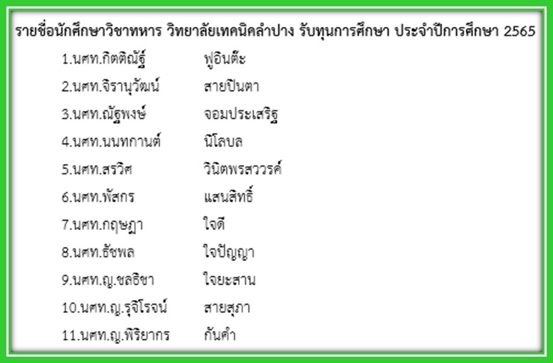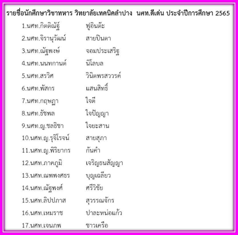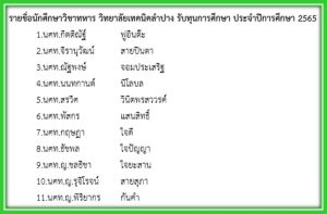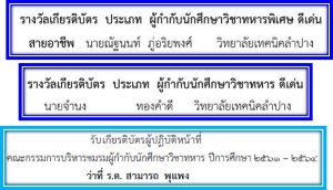 วันพฤหัสบดีที่ 9 กุมภาพันธ์ 2566 เวลา 13:00 น. นายณัฐนนท์ ภู่อริยพงศ์ ผู้อำนวยการวิทยาลัยเทคนิคลำปาง มอบหมาย ให้นางโชติมา วัยวัฒน์ ครูชำนาญการพิเศษ พร้อมด้วยคณะครูฝึกนักศึกษาวิชาทหาร และนักศึกษาวิชาทหารวิทยาลัยเทคนิคลำปาง เข้าร่วมพิธียกย่องเชิดชูเกียรติและรับมอบเกียรติบัตรในงาน “วันเกียรติยศประจำปีการศึกษา 2565” โดยมีพลตรี พลชัยนพรัตน์ ผู้บังคับบัญชา มณฑลทหารบกที่ 32 เป็นประธานในพิธีฯ และมอบรางวัลเชิดชูเกียรติให้แก่ วิทยาลัยเทคนิคลำปางดังนี้ นายณัฐนนท์ ภู่อริยพงศ์ ผู้อำนวยการวิทยาลัยเทคนิคลำปาง ได้รับรางวัลเกียรติบัตร ผู้กำกับนักศึกษาวิชาทหารพิเศษดีเด่น สายอาชีพ ว่าที่ร.ต.สามารถ พุแพง รองผู้อำนวยการฝ่ายพัฒนากิจการนักเรียนนักศึกษา ได้รับรางวัลเกียรติบัตรผู้ปฎิบัติหน้าที่ คณะกรรมการบริหารชมรมผู้กำกับนักศึกษาวิชาทหารปีการศึกษา 2561 – 2564 นายจำนงค์ ทองคำดี ครูฝึกนักศึกษาวิชาทหารวิทยาลัยเทคนิคลำปาง ได้รับรางวัลเกียรติบัตร ผู้กำกับนักศึกษาวิชาทหารดีเด่น และนักศึกษาวิชาทหารวิทยาลัยเทคนิคลำปางได้ได้รับรางวัลเกียรติบัตร นศท.ดีเด่น ประจำปีการศึกษา 2565 จำนวน 17 นาย พร้อมกันนี้ นักศึกษาวิชาทหารวิทยาลัยเทคนิคลำปางได้รับทุนการศึกษา ประจำปีการศึกษา 2565 จำนวน 11 นาย ณ อาคารอเนกประสงค์ ศูนย์การฝึกนักศึกษาวิชาทหารมณฑลทหารบกที่ 32 ค่ายสุรศักดิ์มนตรี จังหวัดลำปาง