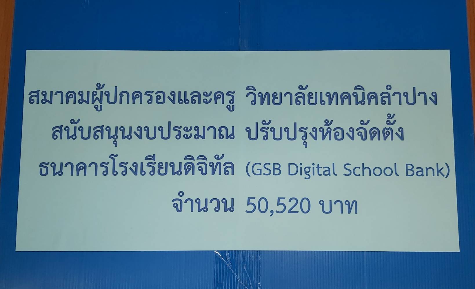 วันพุธที่ 22 กุมภาพันธ์ 2566 เวลา 13.45 น. นายชำนาญ ใจช่วย นายกสมาคมผู้ปกครองและครูวิทยาลัยเทคนิคลำปาง มอบหมายให้ นางโชติมา วัยวัฒน์ เลขานุการสมาคมฯ เป็นผู้ส่งมอบ งบสนับสนุนปรับปรุงห้องและติดตั้งระบบไฟฟ้า เพื่อจัดตั้งธนาคารโรงเรียน งบประมาณ 50,520 บาท (ห้าหมื่นห้าร้อยยี่สิบบาทถ้วน) โดยมี นายณัฐนนท์ ภู่อริยพงศ์ ผู้อำนวยการวิทยาลัยเทคนิคลำปาง พร้อมด้วย ว่าที่ร.ต.สามารถ พุแพง รองผู้อำนวยการฝ่ายพัฒนากิจการนักเรียนนักศึกษา คณะครู และนักเรียนนักศึกษา เป็นผู้รับมอบ ณ อาคารวิทยบริการ ชั้น 1 วิทยาลัยเทคนิคลำปาง