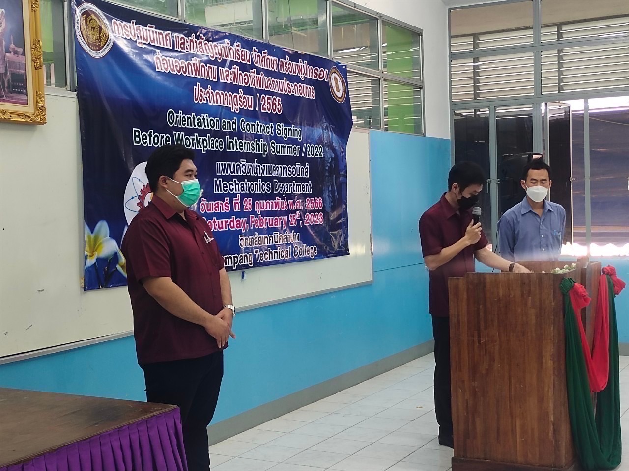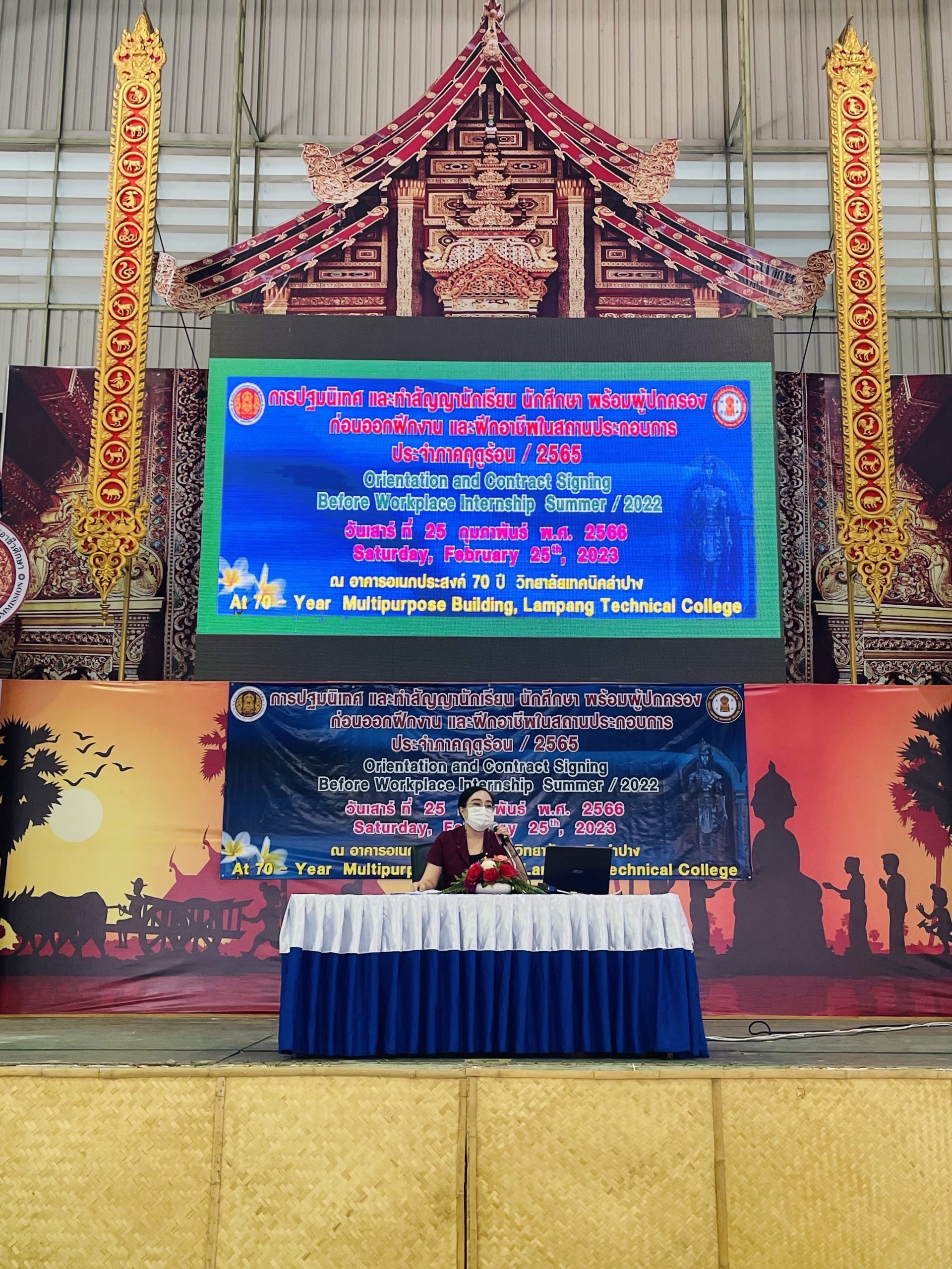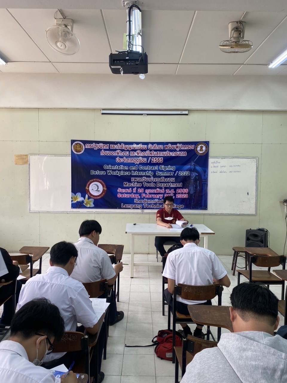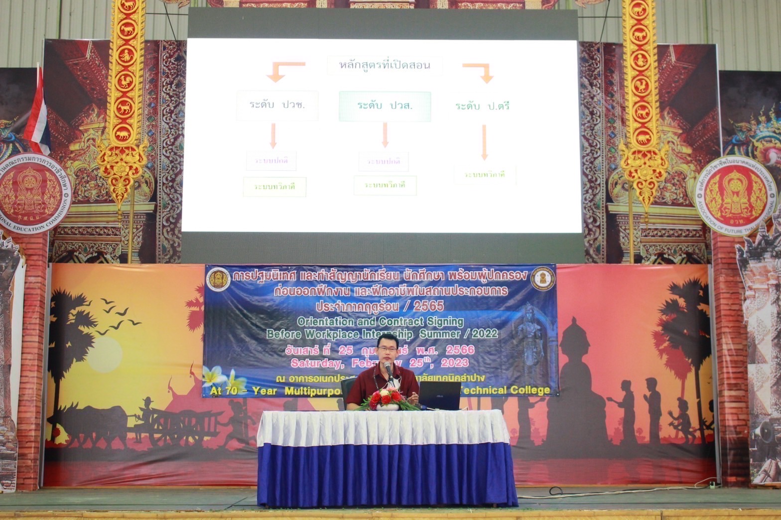 วันเสาร์ ที่ 25 กุมภาพันธ์ 2566 เวลา 08.00 น. นายณัฐนนท์ ภู่อริยพงศ์ ผู้อำนวยการวิทยาลัยเทคนิคลำปาง มอบหมายให้ นางสาวอรณี จริยา รองผู้อำนวยการฝ่ายวิชาการ เป็นประธานในพิธีเปิด การปฐมนิเทศ และทำสัญญา นักเรียน นักศึกษา ก่อนออกฝึกงาน ฝึกอาชีพในสถานประกอบการ ประจำภาคฤดูร้อน ปีการศึกษา 2565 โดยมี นายสุทัศน์ สุขารมย์ หัวหน้างานอาชีวศึกษาระบบทวิภาคี เป็นผู้กล่าวรายงาน พร้อมบรรยาย แนวทางการดำเนินการทำสัญญา การวัดผลประเมินผลร่วมกับสถานประกอบการ การดำเนินการระหว่างฝึกฯ และสิ้นสุดการฝึกฯ และเวลา 09.30 น. นายณัฐนนท์ ภู่อริยพงศ์ ผู้อำนวยการวิทยาลัยเทคนิคลำปาง ได้พบปะ พูดคุยและให้ข้อเสนอแนะ แนวทางการฝึกงาน ฝึกอาชีพในสถานประกอบการ และแนวทาง วิธีการในการหาพื้นที่สำหรับใช้จอดรถให้กับนักเรียน นักศึกษา ของวิทยาลัยเทคนิคลำปาง ซึ่งในการปฐมนิเทศ และทำสัญญา ก่อนออกฝึกงาน ฝึกอาชีพในสถานประกอบการ ในครั้งนี้ มีผู้ปกครอง และนักเรียน นักศึกษา ระดับชั้น ปวช.2 และ ปวส.1 เข้าร่วมปฐมนิเทศ และทำสัญญาฯ จำนวนทั้งสิ้น 1,934 คน พร้อมด้วยทีมงานอาชีวศึกษาระบบทวิภาคี หัวหน้าแผนกวิชาช่าง และคณะครู ผู้เกี่ยวข้องในการฝึกงาน และฝึกอาชีพในสถานประกอบการ ประจำภาคฤดูร้อน ปีการศึกษา 2565 จำนวน 9 แผนกวิชา ได้แก่ แผนกวิชาช่างยนต์ แผนกวิชาช่างกลโรงงาน แผนกวิชาช่างเชื่อมโลหะ แผนกวิชาช่างไฟฟ้ากำลัง แผนกวิชาช่างอิเล็กทรอนิกส์ แผนกวิชาช่างก่อสร้าง แผนกวิชาโยธา แผนกวิชาเมคคาทรอนิกส์ และแผนกวิชาเทคโนโลยีสารสนเทศ ณ อาคารอเนกประสงค์ 70 ปี วิทยาลัยเทคนิคลำปาง