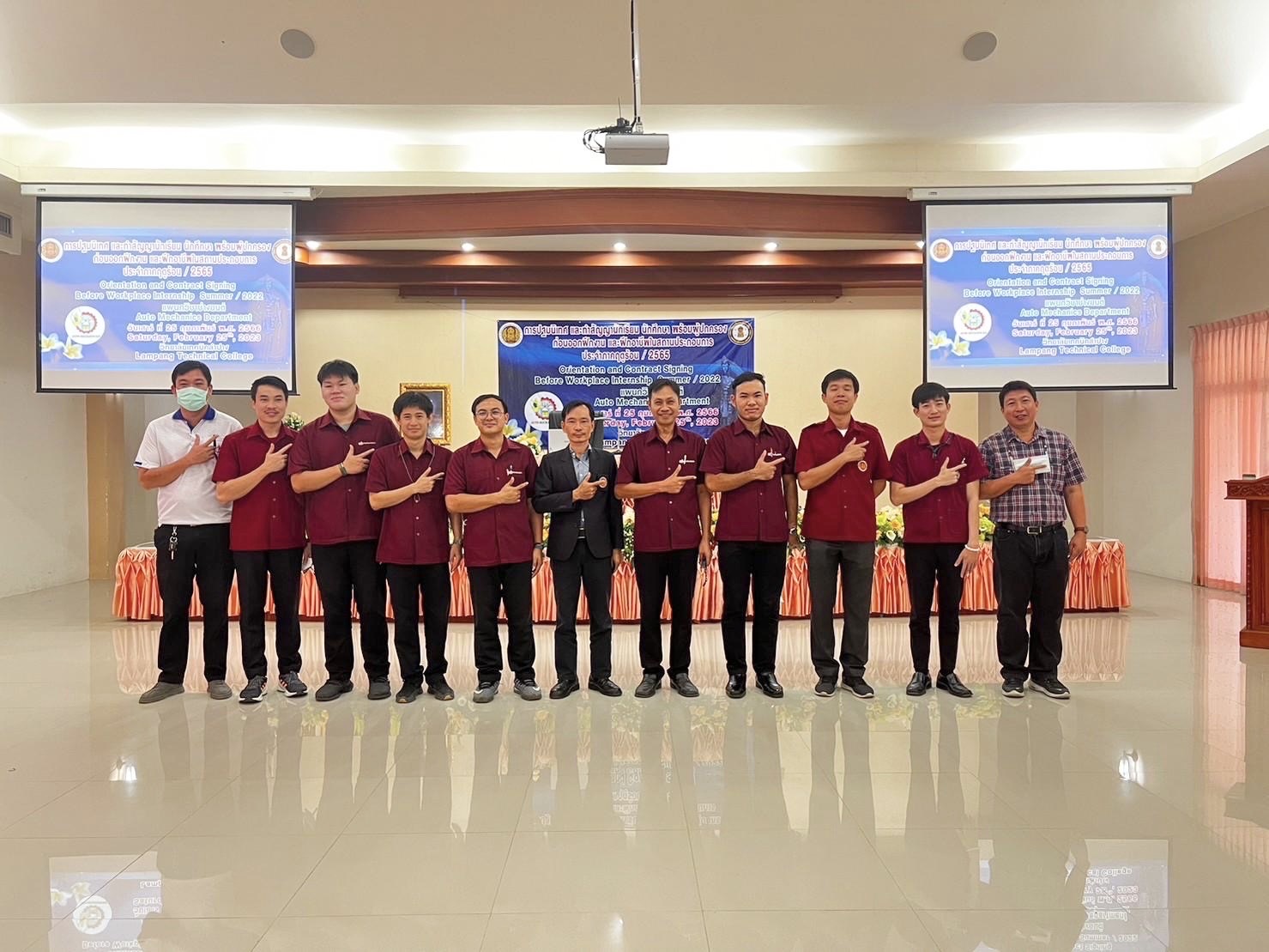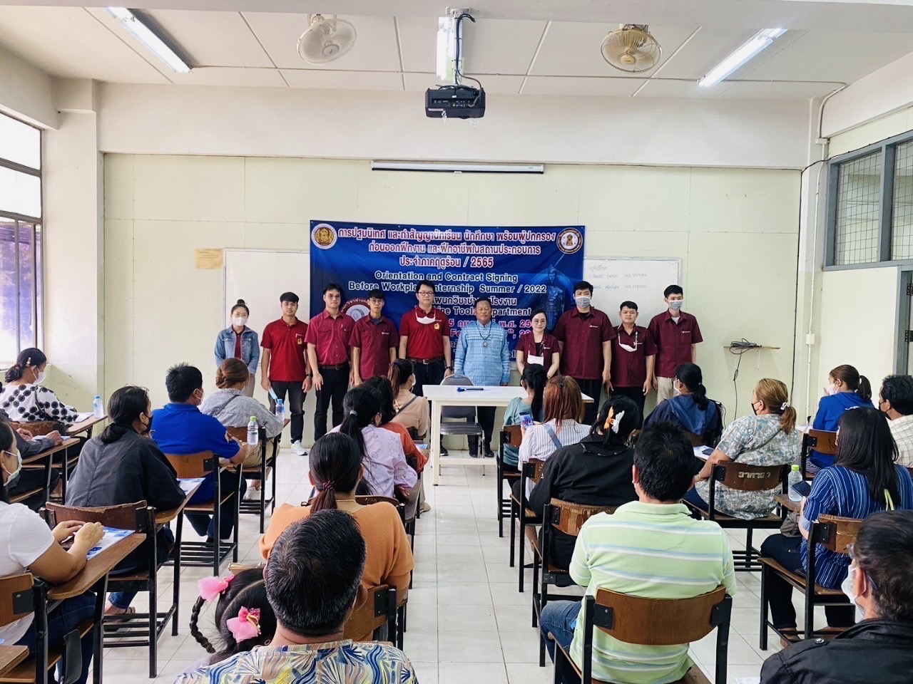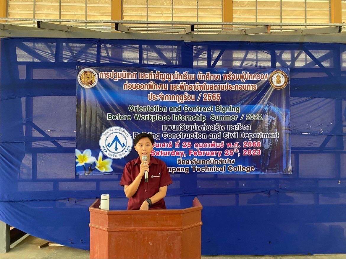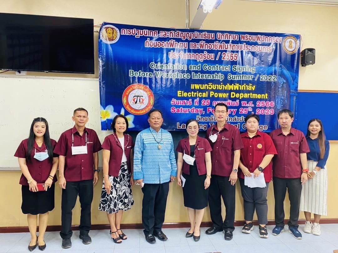 วันเสาร์ ที่ 25 กุมภาพันธ์ 2566 เวลา 08.00 น. นายณัฐนนท์ ภู่อริยพงศ์ ผู้อำนวยการวิทยาลัยเทคนิคลำปาง มอบหมายให้ นางสาวอรณี จริยา รองผู้อำนวยการฝ่ายวิชาการ เป็นประธานในพิธีเปิด การปฐมนิเทศ และทำสัญญา นักเรียน นักศึกษา ก่อนออกฝึกงาน ฝึกอาชีพในสถานประกอบการ ประจำภาคฤดูร้อน ปีการศึกษา 2565 โดยมี นายสุทัศน์ สุขารมย์ หัวหน้างานอาชีวศึกษาระบบทวิภาคี เป็นผู้กล่าวรายงาน พร้อมบรรยาย แนวทางการดำเนินการทำสัญญา การวัดผลประเมินผลร่วมกับสถานประกอบการ การดำเนินการระหว่างฝึกฯ และสิ้นสุดการฝึกฯ และเวลา 09.30 น. นายณัฐนนท์ ภู่อริยพงศ์ ผู้อำนวยการวิทยาลัยเทคนิคลำปาง ได้พบปะ พูดคุยและให้ข้อเสนอแนะ แนวทางการฝึกงาน ฝึกอาชีพในสถานประกอบการ และแนวทาง วิธีการในการหาพื้นที่สำหรับใช้จอดรถให้กับนักเรียน นักศึกษา ของวิทยาลัยเทคนิคลำปาง ซึ่งในการปฐมนิเทศ และทำสัญญา ก่อนออกฝึกงาน ฝึกอาชีพในสถานประกอบการ ในครั้งนี้ มีผู้ปกครอง และนักเรียน นักศึกษา ระดับชั้น ปวช.2 และ ปวส.1 เข้าร่วมปฐมนิเทศ และทำสัญญาฯ จำนวนทั้งสิ้น 1,934 คน พร้อมด้วยทีมงานอาชีวศึกษาระบบทวิภาคี หัวหน้าแผนกวิชาช่าง และคณะครู ผู้เกี่ยวข้องในการฝึกงาน และฝึกอาชีพในสถานประกอบการ ประจำภาคฤดูร้อน ปีการศึกษา 2565 จำนวน 9 แผนกวิชา ได้แก่ แผนกวิชาช่างยนต์ แผนกวิชาช่างกลโรงงาน แผนกวิชาช่างเชื่อมโลหะ แผนกวิชาช่างไฟฟ้ากำลัง แผนกวิชาช่างอิเล็กทรอนิกส์ แผนกวิชาช่างก่อสร้าง แผนกวิชาโยธา แผนกวิชาเมคคาทรอนิกส์ และแผนกวิชาเทคโนโลยีสารสนเทศ ณ อาคารอเนกประสงค์ 70 ปี วิทยาลัยเทคนิคลำปาง